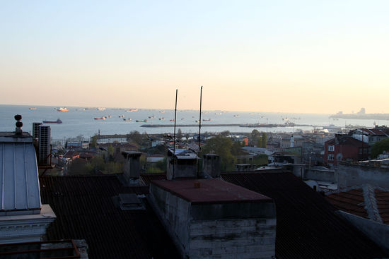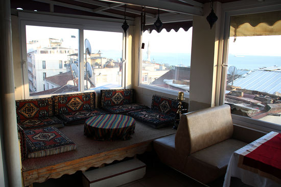 Bisher lagen unsere Zimmer immer mehr oder weniger nebeneinander. Diesmal bin ich im 4. OG und Axel im 2. OG untergebracht. Er hat eindeutig das bessere Bad, dafür habe ich ein großes Bett und das ist mir das wichtigste. Einen Aufzug gibt es nicht. Das Frühstück gibt es im 5. OG mit verglaster Front und damit mit schönem Blick auf den Bosporus.