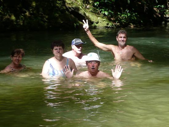 Am Aschermittwoch haben wir dann wieder Erholung im Regenwald gesucht. Matthew hatte sich für diesen Tag etwas Besonderes ausgedacht. "Ihr müsst Badezeug und festes Schuhwerk mitnehmen", hatte er uns am Vorabend gesagt. Als wir aber dann am Ausgangspunkt unserer Regenwaldwanderung sowohl Badezeug als auch festes Schuhwerk anziehen sollten, fingen wir an zu zweifeln. Kann das sein? Ja! Zieht Schuhe und Badezeug an - das ist kein Scherz. Also taten wir, was Matthew uns sagte und harrten der Dinge die da kommen werden. Nach einem kurzen Stück Weg kamen wir an einen kleinen Flusslauf. Matthew zauberte erst wieder eine Flasche Rum aus seinem Rucksack und nach dem Umtrunk wanderten wir dann ca. ein- bis eineinhalb Kilometer im bis zu 1,20 m tiefen Fluß bis zu einem Wasserfall. Nach einer kurzen Rast ging es dann mit nassen Klamotten quer durch den Regenwald wieder zurück zu unserem Ausgangspunkt. Ein Erlebnis der ganz besonderen Art lag hinter uns.