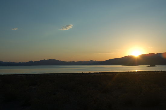 Ich habe herrlich in meiner erhöhten Alkove geschlafen, doch pünktlich um fünf Uhr bin ich hellwach. Auch Jürg ergeht es nicht besser und so geniessen wir das Erwachen des Morgens draussen vor unserem Camper. Gerade wirft die Sonne ihre ersten Strahlen über das Wüstengebirge und lässt das Wasser wie tausend Diamanten glitzern. Jürg kocht uns Kaffee und so sitzen wir gemütlich draussen und erfreuen uns an der herrlichen Stimmung.