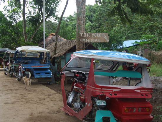 Wenn man in Sabang einmal wegfahren möchte, begebe man sich zum Trycicle Terminal - so die lokale Bezeichnung von der Trycicle Haltestelle und nehme sich ein Trycicle seiner persönlichen Wahl - Fahrer und Vehicle auswählen, je nach Farbe oder Freundlichkeit oder Preisangabe.Ein so benanntes Trycicle Terminal - muss einmalig sein auf ganz Palawan sein.