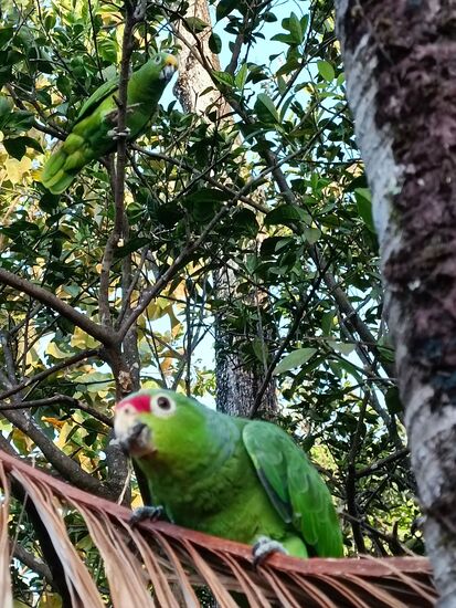 Frühstück mit einem hauseigenen Papageienpärchen. Recht gesprächig.