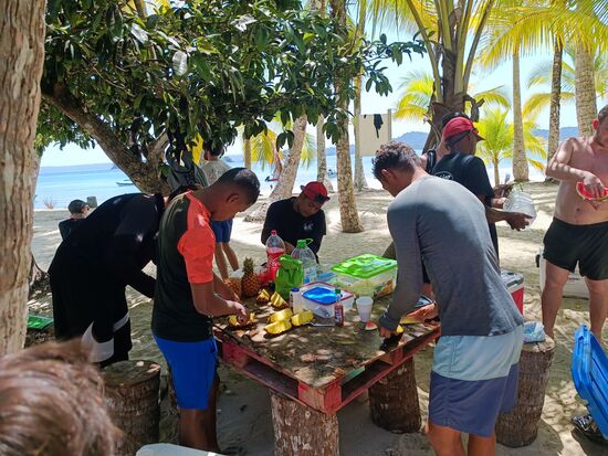 Start ist 8 Uhr und bis 8.30 Uhr sind alle am Strand angekommen und eingewiesen. Diesmal waren es 3 Boote mit je 10 Abenteurern. Überfahrt 90 min., es wird ganz schön Gas gegeben. Wir hatten etwas Wellengang und man wurde ganz schön durchgestaucht. Unterwegs kurz eine Delphinschule in Kielwasser gewesen (die Kamera war zu langsam) und bald waren wir am ersten Schnorchelspot.