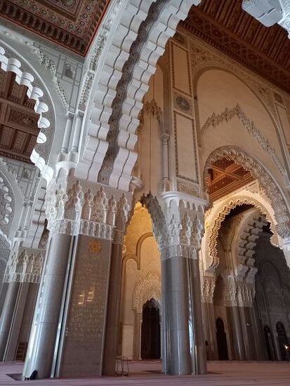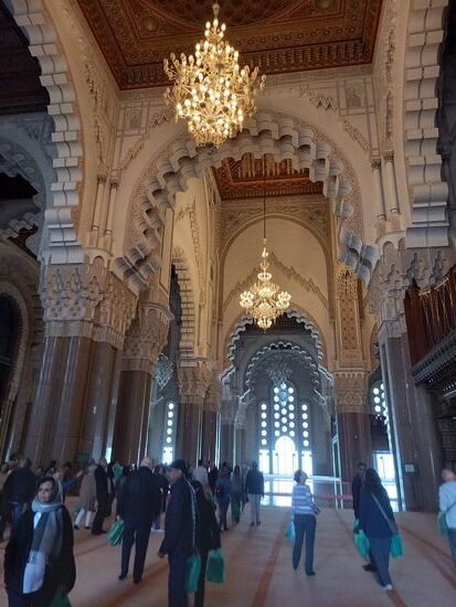 Alle verwendeten Materialien stammen aus Marokko. Einzig das Glas für die Kronenleuchter stammt aus Italien. Frauen und Männer beten getrennt. Die Frauen beten auf der oberen Ebene.