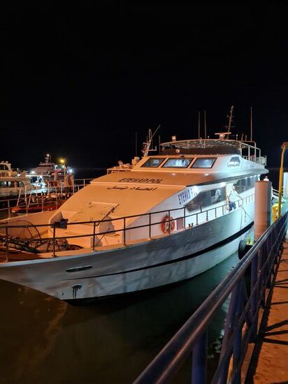 Nach gut 7std ist Bandar erreicht, für einsfuffzich bringt mich ein junger Mann unter nervig lautem Rap zum Hafen und ich erstehe gegen 18h ein Ticket für Hormuz. Eine reizende Frau mit Kind begleitet mich zum terminal, Abfahrt soll erst 21h sein. Oh Gott, 3 Stunden warten? Gegen 19h plötzlich:" kannst jetzt dein Ticket nehmen und einsteigen und es geht mit dem Schnellboot 40min nach Hormuz. Die Fahrt ist rau, mir wird schlecht...