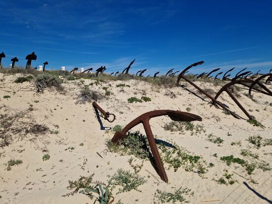 An der Praia do Barril unternehmen wir eine Strandwanderung mit Muschelsammeln. Der Ankerfriedhof hier erinnert an das einstige Fischerdörfchen hier. Zurück fahren wir mit der Strandeisenbahn.