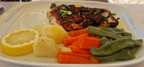 Wieder zurück in Santa Luzia, wollen wir endlich mal Oktopus probieren in der selbsternannten "Oktopus-Hauptstadt". Im Sol e Mar werden wir nicht enttäuscht, wenn man sich erst mal mit der gewöhnungsbedürftigen Optik angefreundet hat, schmeckt er hervorragend.