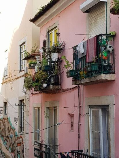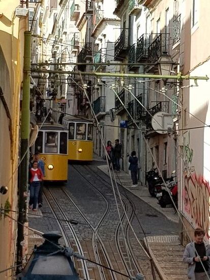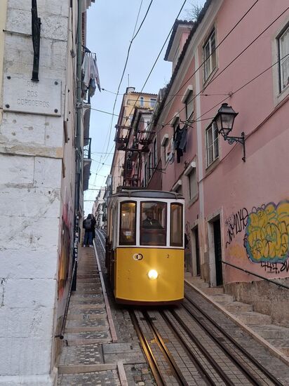 Wir haben einen Gabelflug, hin nach Lissabon und zurück von Porto. Unser Flug von München hat eine halbe Stunde Verspätung wegen eines Unwetters in Lissabon. Bei der Ankunft ist das aber schon vorüber. Unsere Airbnb-Ferienwohnung liegt direkt am Elevador da Bica in der engen Gasse, die nur die Standseilbahn befahren darf. Auch die schmalen Gassen in der Nähe sind für den normalen Autoverkehr gesperrt, nur mit einer Sondergenehmigung kann man einfahren. Aus diesem Grund haben wir den vom Vermieter angebotenen Transfer-Service genutzt, der uns im Airport schon erwartete. Durch viele enge Gassen fahren wir bis zur nächstgelegenen Quergasse am Elevador da Bica. Die Häuser hier sind schmal und verwinkelt, haben aber viel historisches Flair. Die gegenüberliegenden Häuser sind fast zum Greifen nahe.