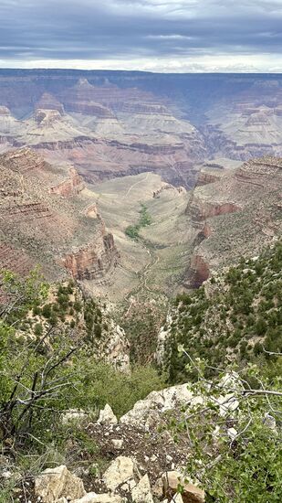 Hier zu sehen - auf Höhe des Colorado-River - die Phantom Ranch. Sie ist die einzige Unterkunft/Hotel im GC und wie gesagt teilweise Jahre im Voraus ausgebucht. Die Ranch besteht aus einem Hauptgebäude und zahlreichen Nebengebäuden. Die Auswahl beim Abendessen ist recht überschaubar: entweder ein Wandereintopf oder Steak mit Bohnen und Kartoffeln. Wie uns die beiden Hiker, mit denen wir gesprochen haben, sagten, kostet das Steak 70 USD - es sei aber auch groß und gut gewesen. Fast alles mit via Muli herunter gebracht. Deshalb sind die Preise auch entsprechend.