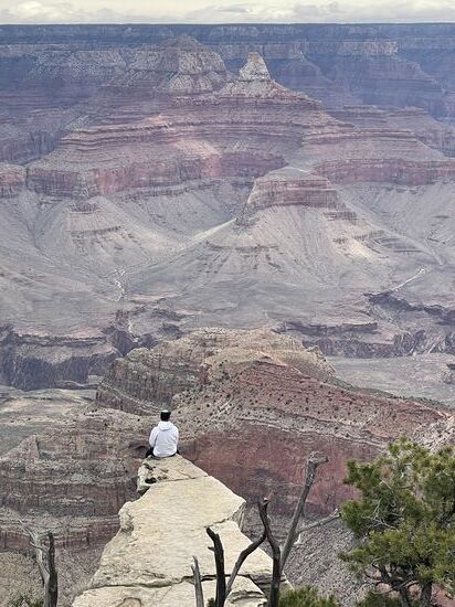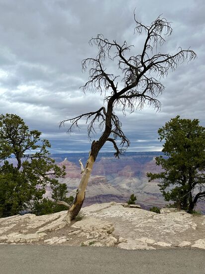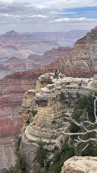 Wir sind gut 7,5 Kilometer entlang des Rim gelaufen und ich wage mich mal wieder etwas näher an den Rand. Wir haben an vielen Stellen Waghalsige gesehen, die selbst mit kleinen Kindern ganz an den Rand gehen, um Selfies zu machen. Wir halten das für unverantwortlich. Jedes Jahr gibt es ca. 12 Todesfälle im GC, insbesondere dort, wo die Touristen sind. 1/3 davon geht auf Abstürze, 2/3 erleiden einen Hitzetod. Im Sommer kann es hier sehr heiß werden, obwohl der Rim auf 2000 Meter und höher liegt. Auf den Trails nach unten - die fast komplett in der Sonne liegen - können es auch mal bis zu 50 Grad werden.