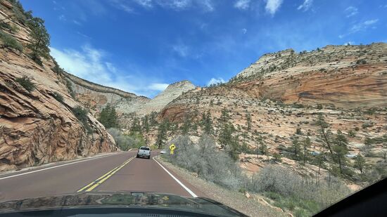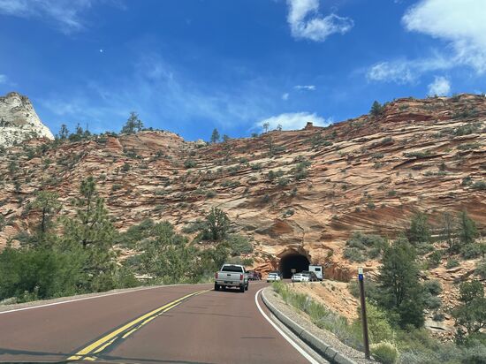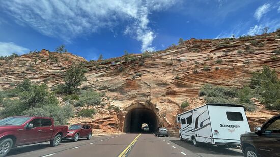 Der Zion-Mount Carmel Tunnel. Baubeginn war in den 1920ern und die Fertigstellung in 1930. Der Tunnel ist 1,1 Meilen (ca. 1,8 km) lang. Fahrzeuge mit einer Höhe von 3,4 Meter oder mehr bzw. Breite von mehr als 2,4 Meter benötigen einen besondere Genehmigung für die Durchfahrt.