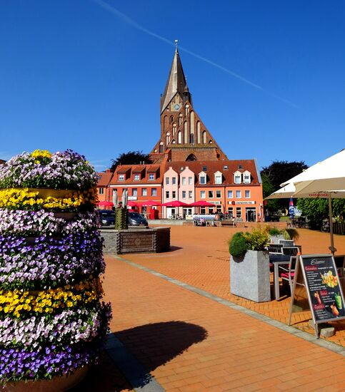 Sind heute recht früh los.......super Radweg durch die Natur bis nach Barth, ganz easy  zu fahren die 14km,....nach 1 Stunde waren wir da. Eine hübsche kleine Stadt mit sehenswertem Altstadtbereich, Marktplatz und der alles überragenden St. Marienkirche. Nach der Tour haben wir uns erst einmal ein Eis am Markt schmecken lassen.