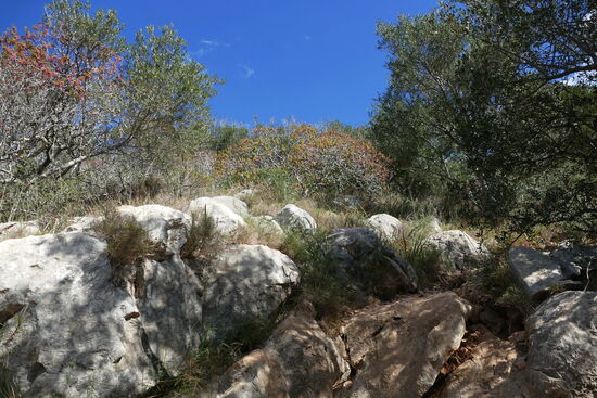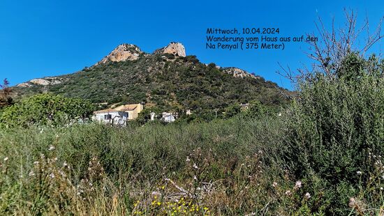 10:30 Uhr starten wir bei herrlichstem Wetter. Es ist sonnig und windstill. Zuerst durch das Wohngebiet, vorbei am Kühllager und dem Gartencenter Can Gosti überqueren wir die Hauptstraße und folgen dem Hinweisschild Via Verde. Auf dieser wandern wir bis zum Abzweig Panoramarestaurant „Bella Vista“ und steigen dort am Parkplatz linksseitig in den eigentlichen Wanderweg ein. Hier wird uns schon einmal bewusst, dass man mallorquinische Wanderwege nicht unterschätzen soll. Denn der Weg ist steil, schmal, geröllig und schroff. Bei einigen wenigen Passagen brauche ich schon mal eine helfende Hand oder eben meine zwei eigenen. Nach vielen Stopps mit Staunen und Fotografieren erreichen wir den Gipfel und suchen das Gipfelkreuz.Auf Fotos im Netz habe ich ein Holzkreuz gesehen. Hier oben ist leider keins mehr. Schade. Ein Gipfelfoto am Gipfelkreuz ist immer eine schöne Erinnerung. Trotzdem ist hier auf dem 375 Meter hohen Gipfel des Na Penyal wunder-,wunderschön!