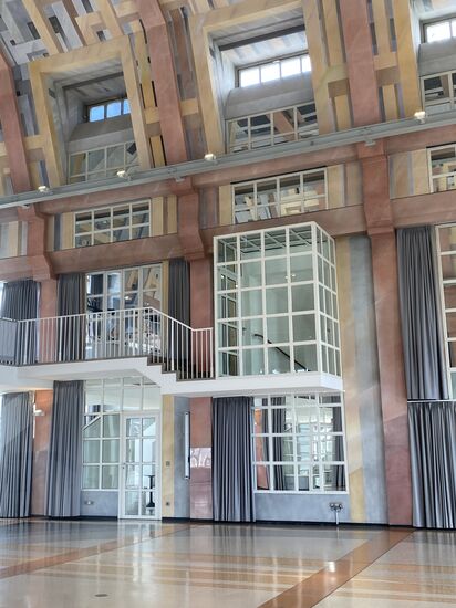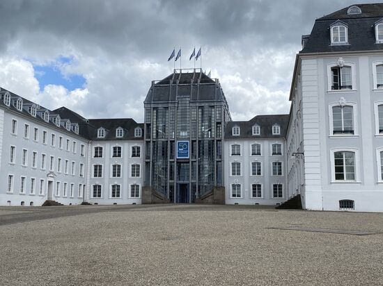 Architekt Gottfried Böhm entwarf einen zeitgenössischen Mittelbau aus Glas und Stahl, der sich gut in das Gesamtensemble einpasst