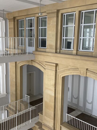 Der moderne Mittelrisalit des restaurierten Schlosses stört in keiner Weise, obwohl im Inneren die unterschiedlichen Geschoßhöhen durch gewollte Integration von alten Elementen sichtbar gemacht wurden.