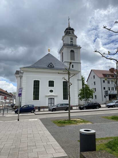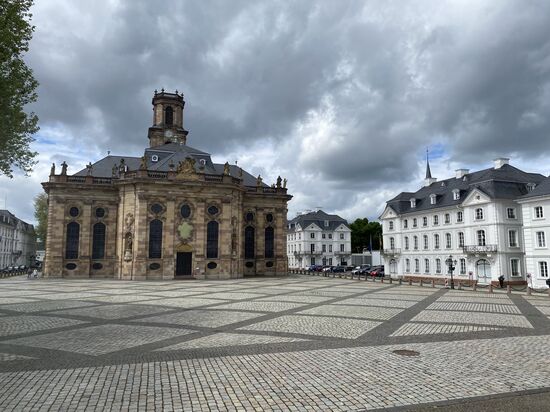 Direkt gegenüber liegt die Friedenskirche. Sie ist der erste Sakralbau, den Stengel 1743 für die reformierte Gemeinde in Saarbrücken gebaut hat. 1892 erwarb sie die alt-katholische Gemeinde und nutzt sie seitdem als ihre Pfarrkirche. Von 2016 - 2021 wurde die Quersaalkirche u. a. mit Hilfe des Städtebauprojekts „Barock trifft Moderne" umfangreich saniert.