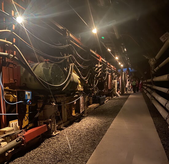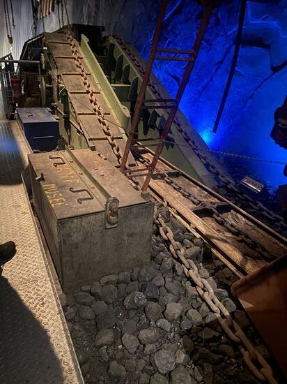 Im simulierten Förderkorb geht auf 1200m unter Tage - 3m in die Tiefe in 2 min - das Ganz hat nur einen Fehler: unten angekommen ist es nicht 12° wärmer!