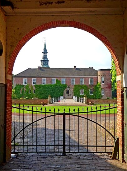 Das Wasserschloss ist Mitte des 14. Jh. entstanden. Es wurde im Laufe der Jahrhunderte mehrfach umgebaut. Es besteht aus 3-flügeliger Vorburg, Park, Wohnhaus und Schloss. Die 3-flügelige Vorburg gehört zur vom Häuptling Unico Manninga in 1557 und 1576 erbauten 2. Anlage, der Torturm von 1731 zur dritten. Das Schloss entstand erst in den Jahren 1959-1960 auf den Grundmauern des Vorgängergebäudes, nachdem es zunächst im 2. Weltkrieg zerstört wurde, danach, provisorisch wieder hergerichtet, im Jahre 1956 einem Grossfeuer zum Opfer fiel. Eine Besichtigung des Schlosses ist nicht möglich, da es bis heute der Wohnsitz der Grafen zu Inn- und Knyphausen ist.