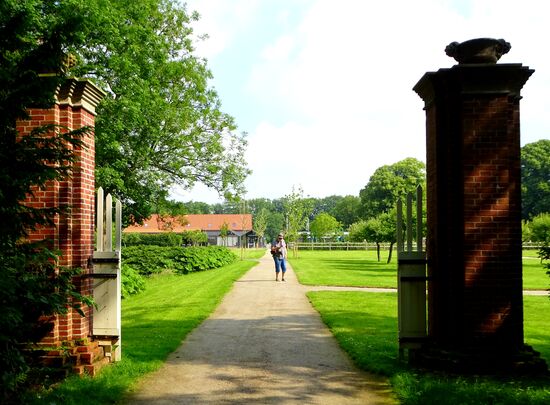 Der Schlosspark entstand Anfang des 18. Jh. als Barockgarten, wurde aber in den Jahren 1790-1813 auf Anweisung des Freiherrn Edzard Mauritz Freiherr von Inn- und Knyphausen vom Hofgärtner Carl Ferdinand Bosse als engl. Landschaftsgarten neu angelegt. Er gilt mit seinen 30ha als grösster priv. Landschaftsgarten Norddeutschlands.