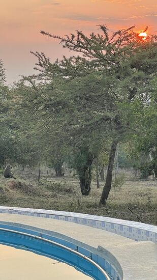 Die Lodge ist wunderschön. Sie liegt mitten im Park und wir sehen hinten viele Affen.