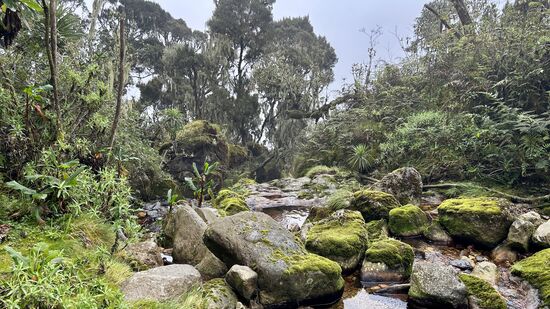 Als Vorspeise leckeren Porridge und im Anschluss Spiegelei, Bratkartoffeln und kleine Würstchen. Unglaublich was auf der Höhe in so einfachen Hütten möglich ist, sowas hätten wir nicht erwartet. Wir schaffen nicht alles so früh am Morgen und sind froh, dass wir noch Zeit zum Verdauen haben, da um 9 Uhr der Aufbruch geplant ist. Wir packen unsere Sachen, füllen die Trinkblasen der Rucksäcke mit dem von den Köchen bereitgestellten abgekochten Wasser des kleinen Wasserfalls direkt neben dem Camp und dann geht’s auch schon los zur „Mutinda Hütte“.