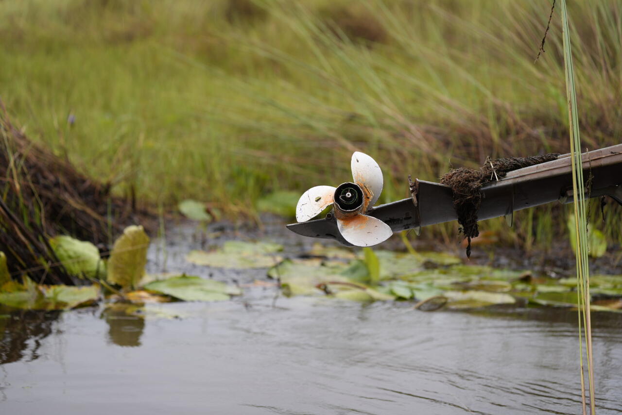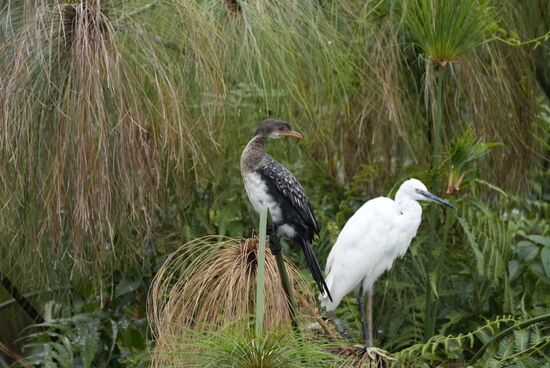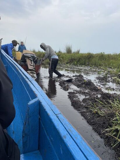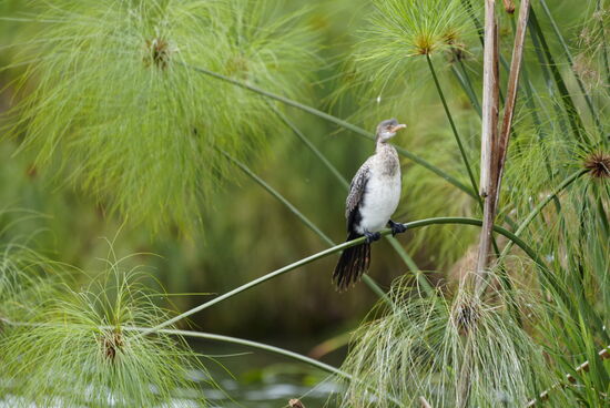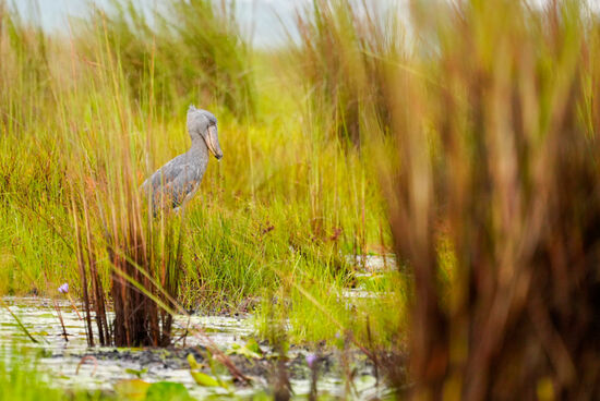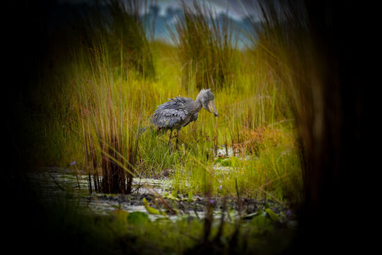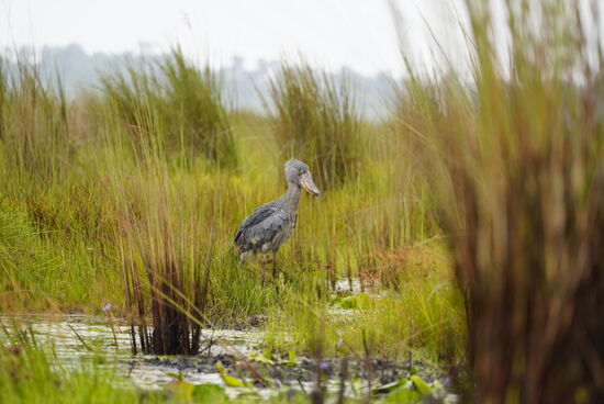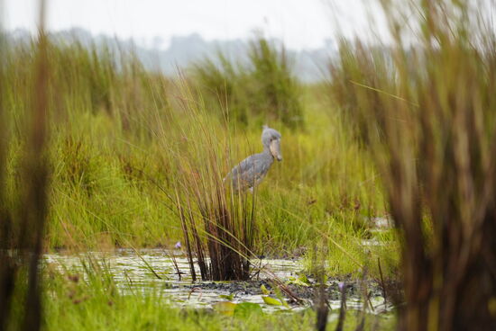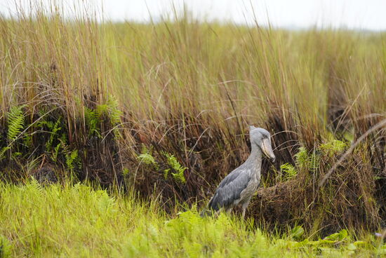 Nach einem kurzen Kaffeestopp geht es direkt weiter zum Lake Victoria, wo wir den Schuhschnabel spotten wollen. Am See angekommen erwartet uns der erste Kulturschock. Wir müssen uns durch die Menschenmenge eines Obst- und Gemüsemarktes bis zu unserem Boot kämpfen. Kaum wurde der Motor angeschmissen, fing es auch schon an zu regnen. Zunächst reichten zwei Regenschirme aus, um uns trocken zu halten. Als der Regen dann aber immer stärker wurde und sich noch Blitze dazugesellten, tauschten wir die Regenschirme schnell gegen eine große Plastikplane, unter der wir uns verstecken konnten. So ging es ungefähr eine Stunde mit dem Motorboot zu den Sümpfen, wo die Schuhschnäbel leben.