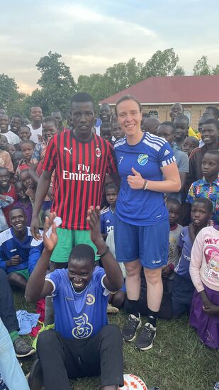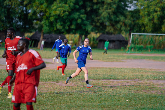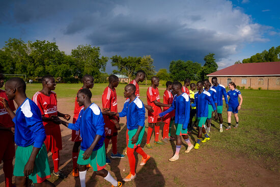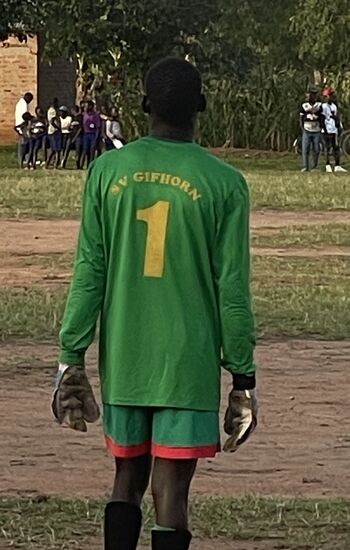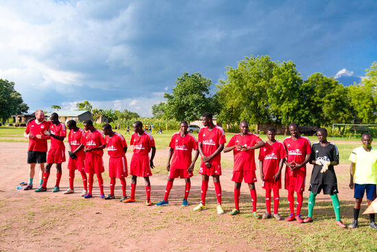 Endlich Aufstellung zum Spiel! Auch die andere Mannschaft ist mit einem gespendeten Trikotsatz ausgestattet!