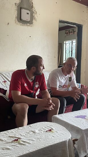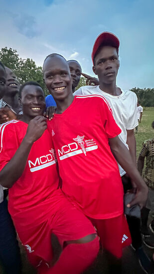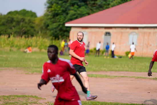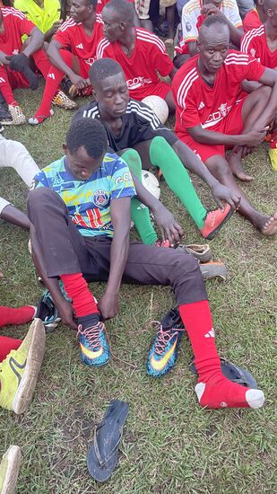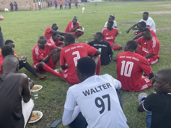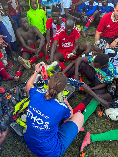 Thomas hat für die ganze Mannschaft Trikots gesponsert—stolz laufen die Jungs damit auf—sie bekommen als erstes von dem Essen