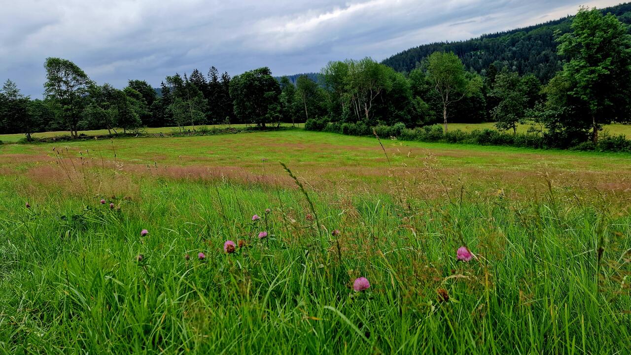 Nach ein paar Schritten schon der Hinweis zur Stiftskanzel, einem Aussichtspunkt. Nur 500 Meter. Na das paßt doch! Über blühende Wiesen, steinige Wege und am Ende mit einer Seilunterstützung geht es steil hinauf. Und oben? Ein wunderbarer Blick über das Tal mit dem Feriendorf und unserer Unterkunft. Und da wir noch Zeit haben, wählen wir für den Rückweg nicht dieses kurze steile Stück, sondern laufen auf dem Kamm über Wiesen und Nutzwege zurück zur Unterkunft.