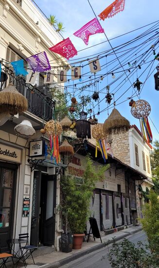 In Psyri gibt es viele schöne und gute Lokale. Hier rechts das Picky, welches sich übers Eck in eine Gasse und in einen Innenhof ausbreitet.