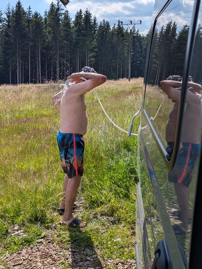 stehen wir wieder auf dem Parkplatz bei Rothesütte und probieren zum ersten Mal unsere Aussendusche am Van aus - es war unbeschreiblich