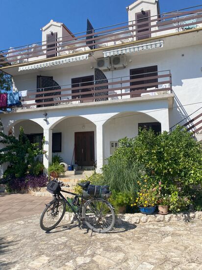 In Pakostane fragte ich an kleinen Pensionen ob sie noch ein Zimmer hätte. Es war aber alles voll. Ein netter älterer Mann riet mir am Wasser etwas weiter zu fahren. In den nächsten Dörfern sei die Wahrscheinlichkeit größer ein Schlafplatz zu bekommen. Das tat ich auch. Die Strecke am Wasser war richtig schön.