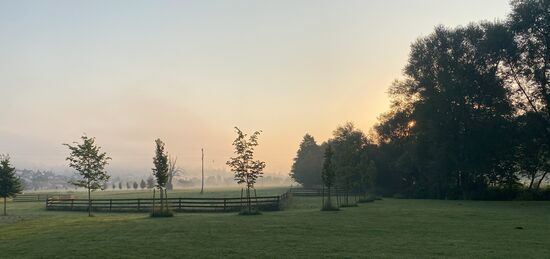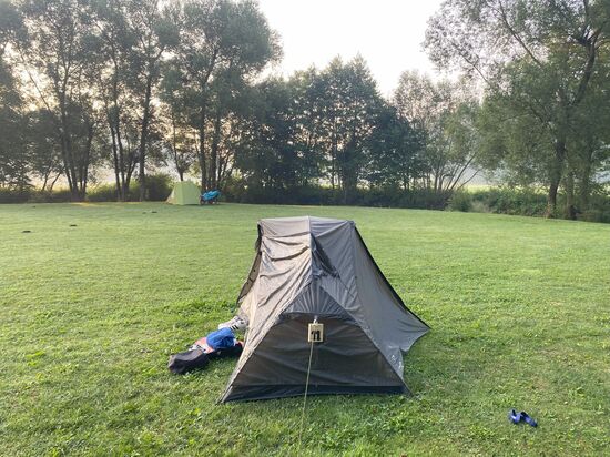 Ich wachte früh auf, ging in den kleinen Waschcontainer und baute ab. Am Ende ging ich nochmal zu einem kleinen Fluß, der um den Campingplatz herumfloß. Total schöne Morgenstimmung.