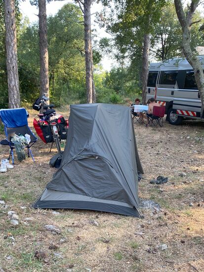 In der Rezeption sagte man mir, dass ich in den Campingbereich xy gehen, mir eine freie Parzelle suchen, die Nummer merken und zurückkommen sollte. Darauf hatten weder ich noch die Motorradfahrer noch wirklich Bock drauf. Egal wir wanderten hin und stellten fest, dass es überhaupt keine freien Parzellen mehr gab. Die Frau in der Rezeption sagte dann zum Glück, dass wir uns einfach ein Plätzchen im Pinienwald suchen sollten. Danke, dass wollte ich hören. 10 Minuten später stand mein Zelt auf dem Boden und ich unter der eiskalten Dusche.