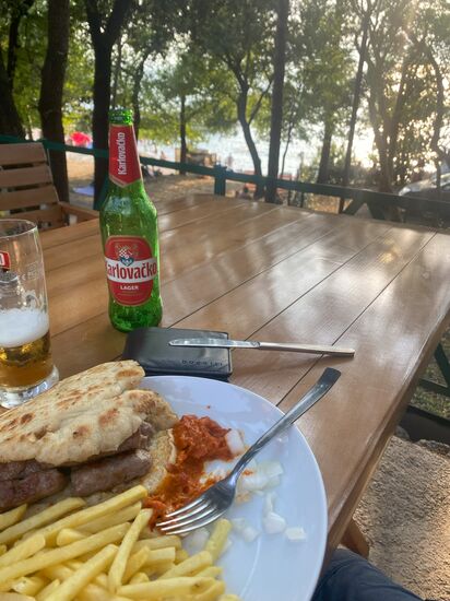 Ich musste durch Rijeka fahren. Es war mal wieder richtiger Stadtverkehr. Im Hafen war es gar nicht so leicht den richtigen Weg wieder raus zu finden. Die Hitze schlug mir mal wieder frontal mit aller Härte mitten auf den Kopf. Ich hatte schon über 100 km in den Waden, ich hatte gefühlt mittlerweile 2 zehn Liter Eimer an Wasser in mich reingeschüttet und genauso viel schien über den Schirm meiner Basecap vor meinen Augen auf die Straßen getropft zu sein. Ich bin zwar 1.250 Meter runter gefahren aber trotzdem auch 1.040 Meter bergauf. Kurzum ich wollte unter eine Dusche und an einen mit einem großen Teller und einem riesigen Bierglas geschmückten Tisch. Nach weiteren 13 langen km fand ich einen Campingplatz in Ostro.