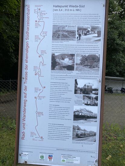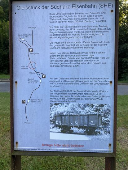 Im Ort Wieda hat man ein original Gleisstück bei Bauarbeiten gefunden und es an Ort und Stelle belassen. Auf diesem "Rollbock" wurden Güterwagen mit Normalspur aufgesetzt. Damit ersparte man sich das Umladen von einem Wagon auf den anderen.