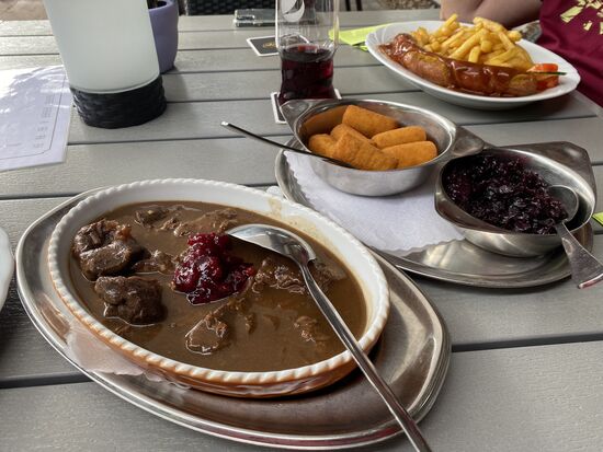 Wir haben aber beide was passendes gefunden. Bei mir gab es Rehragu mit hausgemachtem Rotkohl und Kroketten. Steffi ist bei der Currywurst hängen geblieben. Das Essen war sehr gut und wir froh über die Empfehlung.