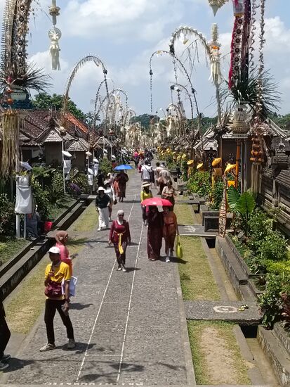 Um das Dorf verteilt gibt es mehrere Parkplätze, ins Dorf hinein geht´s zu Fuß. Es ist eine Art Museumsdorf...schmuck hergerichtet. Wie oft auf Bali die Häuser an einer Straße aufgereiht. Ohne Frage: Schön anzusehen.