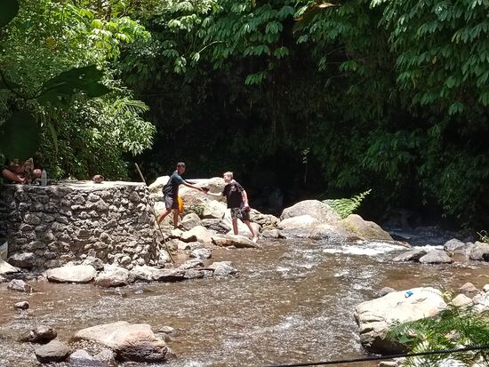 Viele, viele Stufen und dann kamen wir zum ersten Wasserfall, schon gut zu hören. Es ging durch den Fluss...und auch ohne Affen kann ein Schuh abhanden kommen. Raphaels Schlappe war in der Strömung entschwunden.