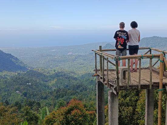 Anfahrt erst an der Küste ostwärts und dann in die Berge...es gibt hier durchaus ordentliche Straßen...aber die hatten wir mit Maps nicht erwischt. Abr nach einer reichlichen Stunde waren wir am Startpunkt. Man kann nicht direkt ranfahren, dafür sind die Wege zu schmal. Also gibt es Guideservice inkl. Motorbike. Die Tour insgesamt pro Nase 300K...für balinesische Verhältnise nicht ganz wenig. Die große Tour mit 6h war uns zuviel und so begnügen wir uns mit einem kleinen Reisfeld und zwei Wasserfällen statt der Reisterrassen, die sehen wir woanders noch. Zudem gibt es hier noch eine Naturwasserrutsche (mit Reifen), aber auch die würde nur zu den 6h gehören.