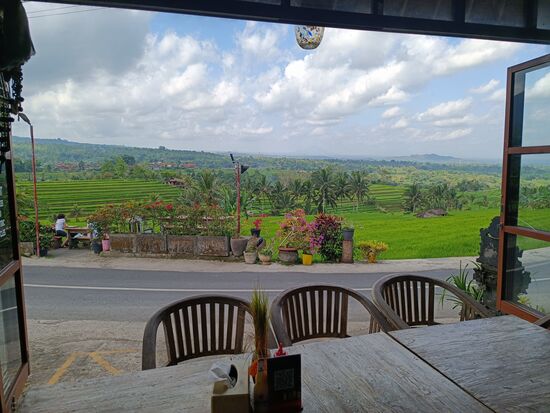 Nach ca. 1,5 h ist unsere Runde durch die Reisterrassen beendet und wir gönnen uns noch etwas Erfrischendes und was Süßes (frittierte Bananen...lecker), nur Raphael tanzt mit Frühlingsrollen aus der Reihe (waren auch lecker). Wir saßen drüben auf der anderen Seite der Straße mit Blick zum Reisfeld...aber der Blick aus dem Restaurant bei der Bezahlung hat auch etwas.