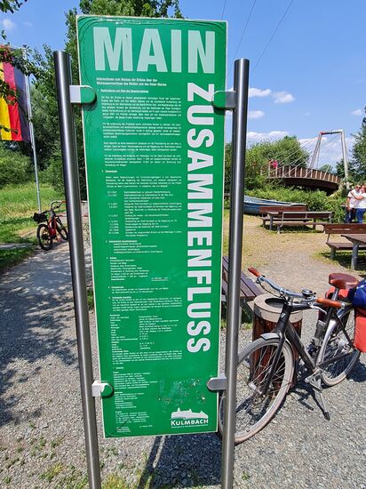 Noch mind. 34 km sind heute abzustrampeln, denn in Romansthal südlich von Lichtenfels liegt meine vorgebuchte Unterkunft. Das nächste Nahziel ist jedoch der unweit von Kulmbach bei Steinenhausen gelegene Mainzusammenfluss, ab wo Weißer und Roter Main nur noch als MAIN verbleiben.