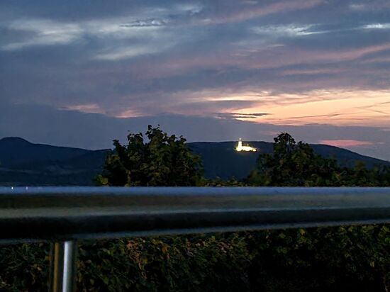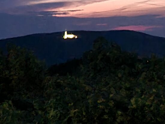 Jetzt wieder (fast) zu Tale, etwa 100 hm (Höhenmeter) tiefer als die visitierte Basilika Vierzehnheiligen, erscheint wieder eine auffällige Immobilie, allerdings auf der Anhöhe der anderen Seite des Maintals und noch dazu bei ungünstigen Lichtverhältnissen. Die Auflösung des Rätsels folgt bald am Anfang des zweiten Tages.