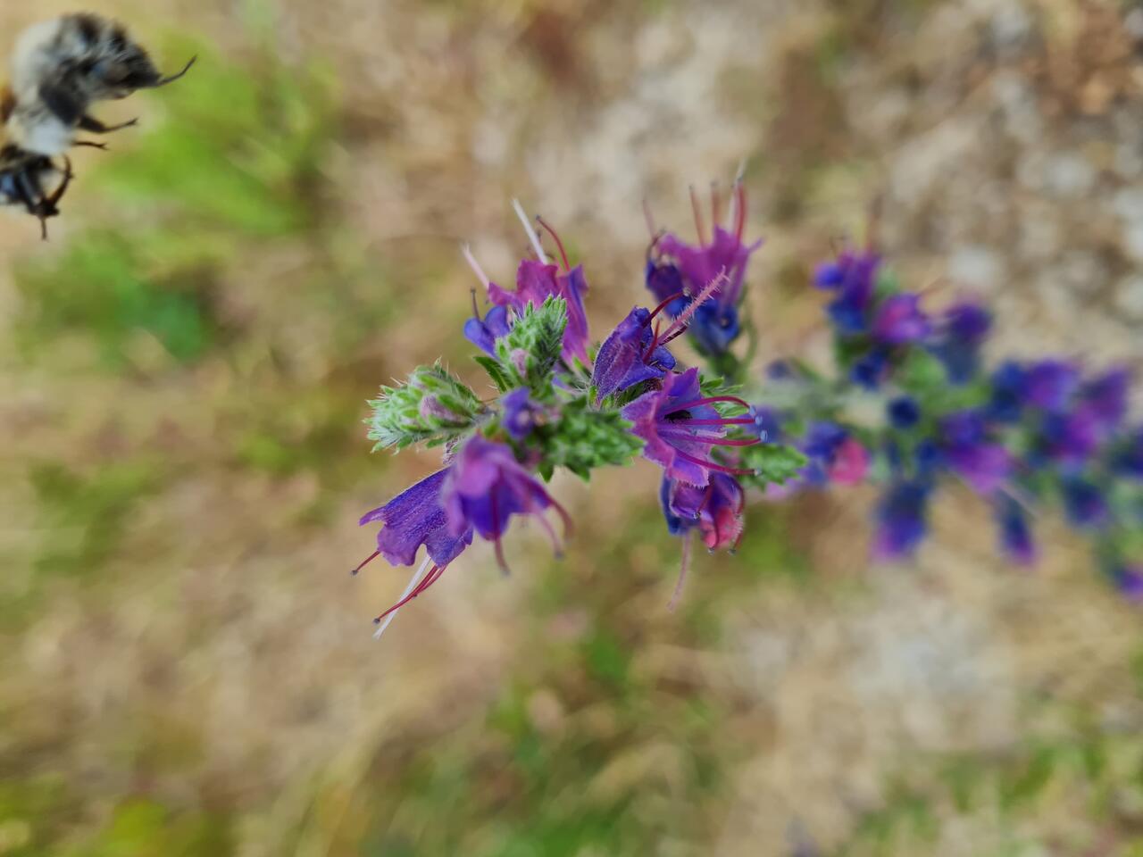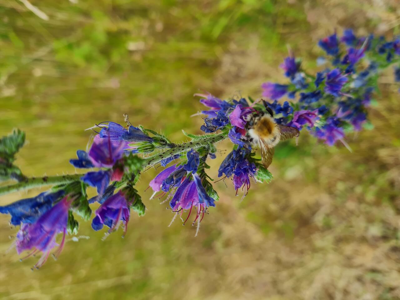 Endlich weg von menschlichen Technik- und Designbefindlichkeiten gibt es nach kurzer Weiterfahrt bei der Ortschaft Wiesen schon wieder einen Zwischenstopp, als sich eine Ackerhummel an der Nektarausgabe eines "Gewöhnlichen Natternkopfs" bedient.