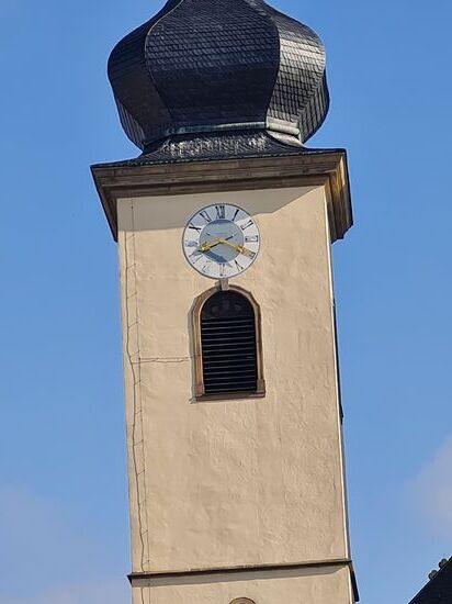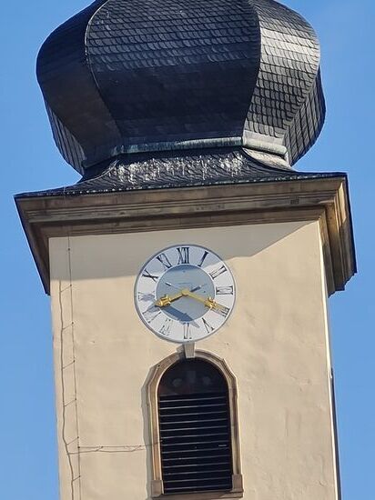 Bevor wieder ernsthaft die Pedale traktiert wurden, wobei man eigentlich ja sich selbst traktiert, hab ich die Türme der Pfarrkirche mal mit verschiedenen Zoomstufen solange ins Visier genommen, bis der Uhrenvergleich mit meiner Armbanduhr abgehakt werden konnte.