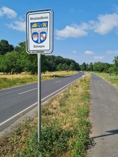 Und als aufmerksamer Schilderleser, der auf zwei Radferntouren bereits in früheren Zeiten zweimal von Norddeutschland in die Heimat die Teilstrecke von Gemünden nach Würzburg am Main entlang zurückgelegt hat, ein drittes mal dieses Jahr 2024 in entgegengesetzter Richtung (siehe "Main-Radferntour 2024", zu einem späteren Zeitpunkt folgend), kann ich nur davon ausgehen, daß da die kürzeste Verbindung über die Prärie gemeint sein kann und nicht der Fahrweg über das von hier aus fast komplette Maindreieck entlang.