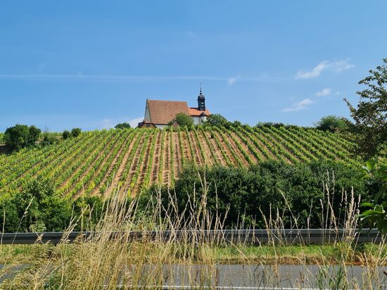 Kurz vor Volkach erscheint auf der Anhöhe des Volkacher Kirchbergs über dem Weinhang die Kirche "Maria im Weingarten".