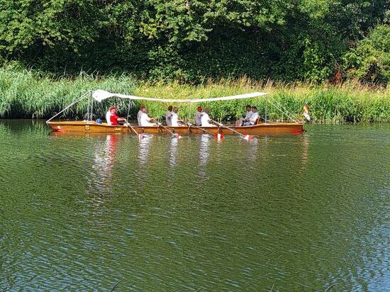 Eine gemütliche Rudergemeinschaft in Form eines Achters mit zwei Steuermännern in nicht-olympischer Sitzanordnung zieht gemächlich seine Bahn flußabwärts bei Volkach.