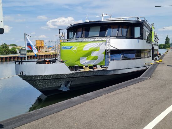 Die "Catwalk", das Bayern 3 - Partyschiff für max. 700 Passagiere, 45,8 m lang, 9,3 m breit, 0,8 m Tiefgang und 2 x 300 PS Maschinenleistung pausiert an der