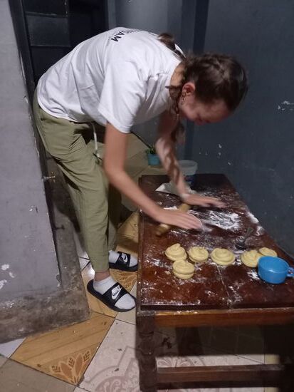 Witness fragt mich, was ich gern zu Abend essen möchte und ich äußere den Wunsch nach Chapati. Ich ahnte allerdings nicht, mit welch einem Aufwand das verbunden ist. Maria und ich haben in die Küche geschaut und Maria durfte gleich selbst einen Teigfladen ausrollen. Wir hatten richtig viel Spaß!