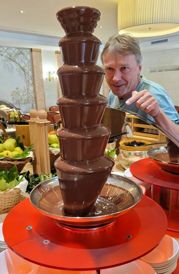 Das Frühstückbuffet ließ wirklich keine Wünsche offen. Alles frisch geschnitten und appetitlich gerichtet. Honig konnte mit den Waben verspeist werden. Viele köstliche Kuchen und Schokofondue wartete auf die Schleckermäulchen. Alles für ein Manni gerechtes Müsli war vorhanden, ....